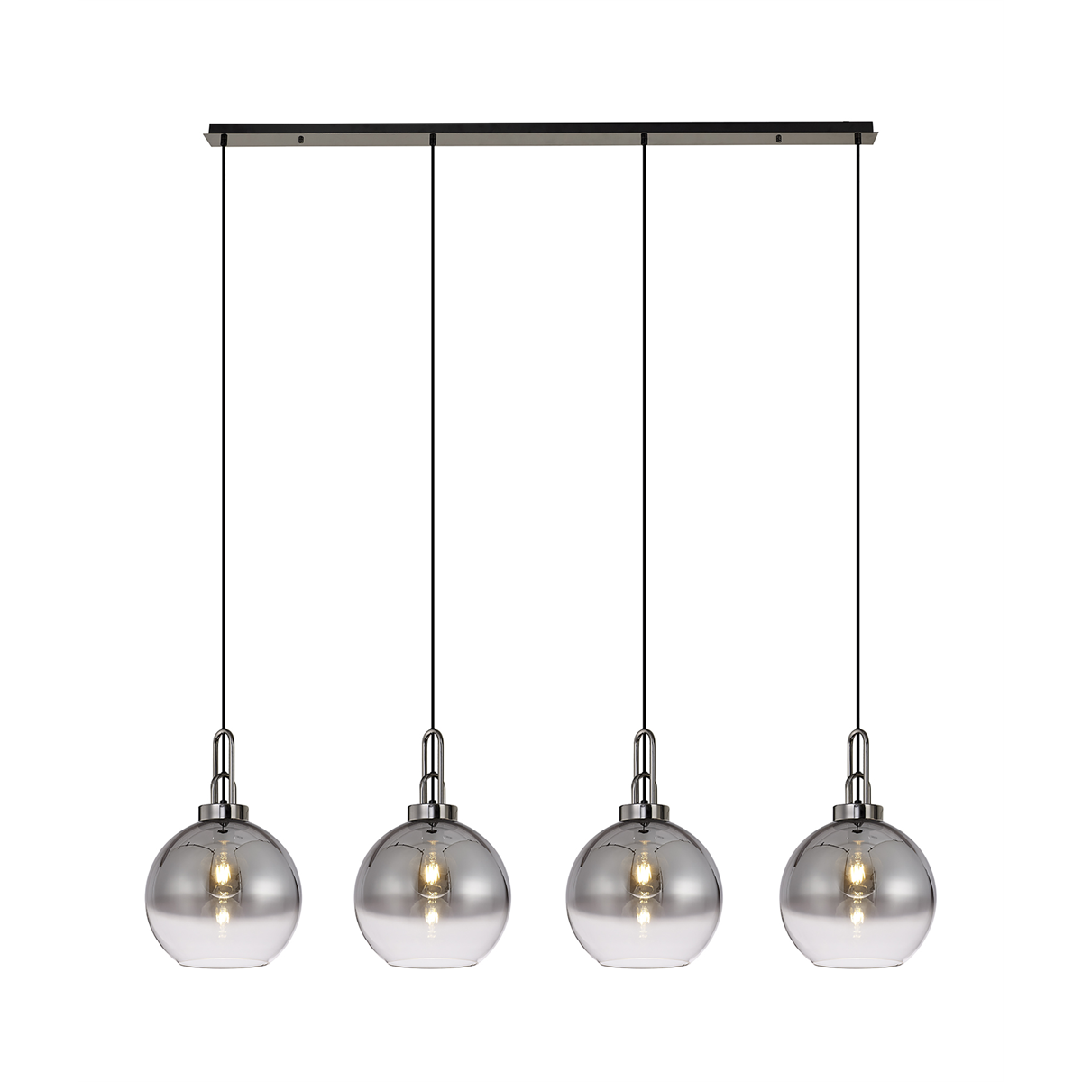 A linear, 4 light, bar suspended pendant with ombre glass shades. The black chrome fittings, smoked black glass and adjustable black fabric flex make this a contemporary light with a vintage twist. Either hang all pendants at the same height or stagger them for an interesting effect.