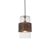 A single lamp pendant in a copper patina finish with a clear glass shade. Height adjustable at the time of installation by altering the 1.2 meter black, fabric flex. The solid, clear glass, cylindrical shade is wrapped in a metal belt with a beautiful patina that allows the chosen filament bulb to peak out from beneath. The simple design and clean lines are complimented beautifully by the depth and warmth of the metalwork.