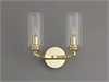 An double lamp, switched wall light in an polished gold finish with clear glass shades.