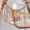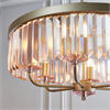 A stunning, 6-light, champagne painted chandelier enveloped by long pieces of soft, rose-pink, faceted glass which diffuse and reflect the light. The six E14 lamp holders curve elegantly up from the base and the lamps sit on beautifully faceted, rose-pink glass bobeches. Attached to the base of the fitting is a matching, decorative, cut-glass disc. This crystal infused pendant catches the light and bounces it around the room creating a striking pattern of light.
