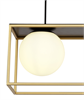 A 3 light, linear pendant suspended from a matt black bar. A trio of frosted white globes surround the E14 lamp holders which appear to float in a cuboid, gold frame with matt black detailing. This light is height adjustable and would look great suspended over a dining table, breakfast bar or modern kitchen counter.