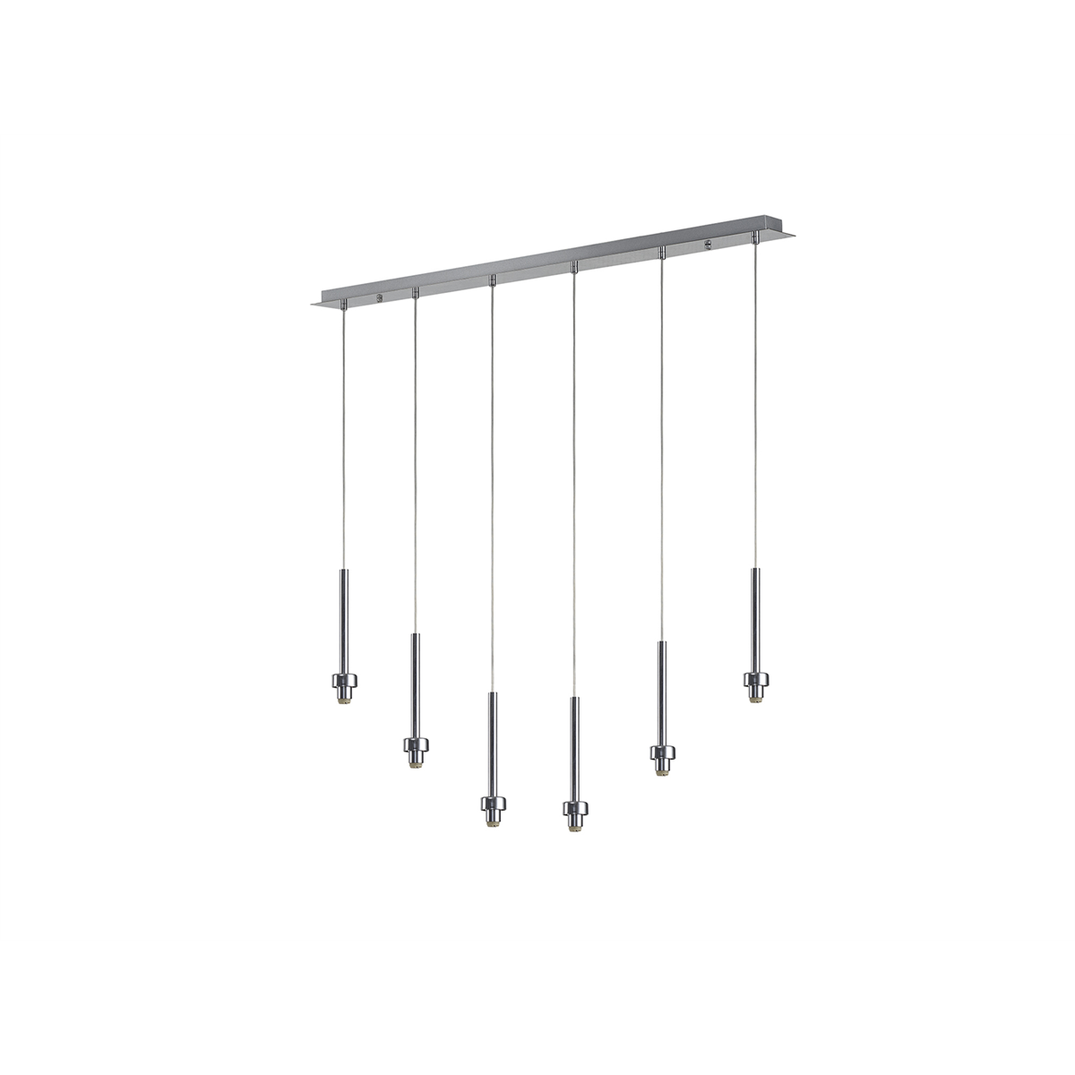 A linear, 6-light, bar suspended pendant frame in a polished chrome finish. This would work wonderfully in a living room, dining room or bedroom. Use in commercial settings such as hotels, bars or restaurants to add warm and ambient illumination. With a maximum drop of 2m, hang the pendants in a cascading waterfall design or stagger them for an interesting effect. Allowing you to choose from an array of compatible glass shades, this is a truly bespoke light fitting which can be made to fit any space.