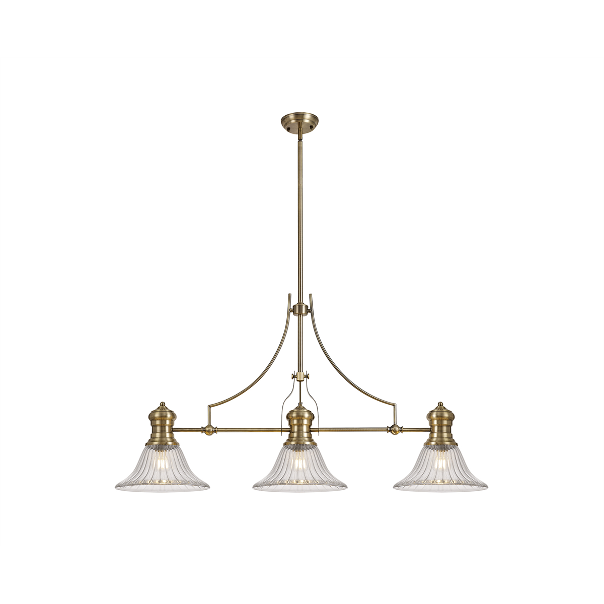 A 3 light pendant in an antique finish with substantial, textured glass shades. This light is fully adjustable as the central shade can be tilted by adjusting the bolts that hold it in place. Multiple height options are also possible due to the various lengths of drops rods included.