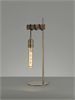 A single lamp table light in a vintage yet modern style featuring wood and antique brass detailing.