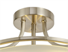 Palmer is a modern, semi-flush ceiling light available in two finishes: satin nickel or antique brass. Three slim arms curve down from the ceiling plate and hold a slender metal hoop which frames the glass shade. The large, 350mm, bowl shaped diffuser conceals the three E27 lamp holders whilst gently filtering and dispersing the illumination emitted from the chosen lamps used.