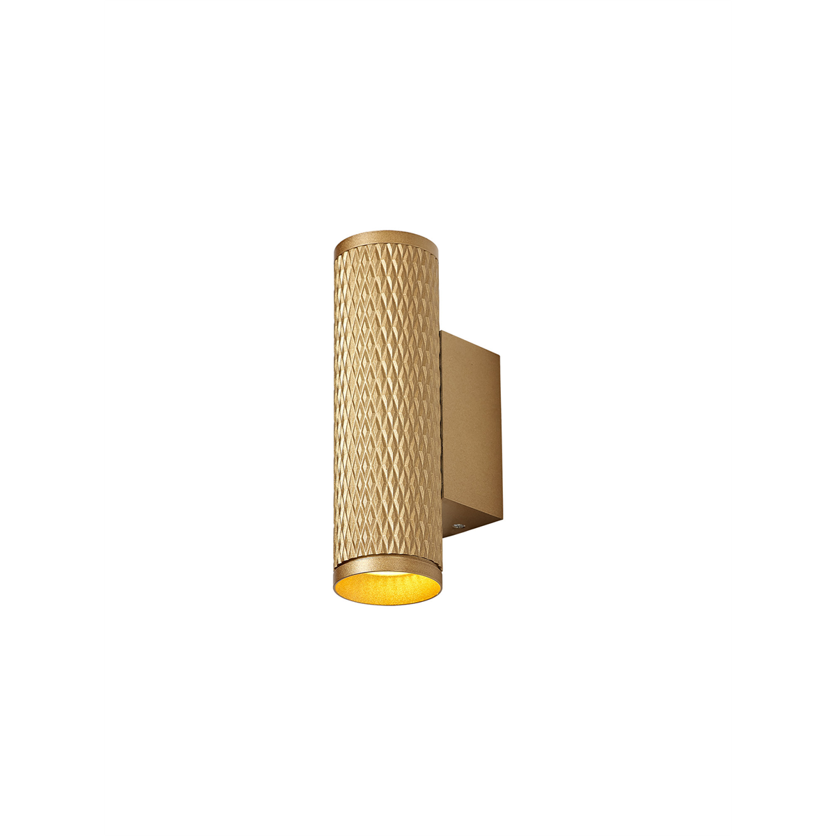 A twin light, wall lamp in a champagne gold, textured finish. This fitting is a bi-directional light source so projects illumination both up and down.
