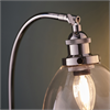 A single lamp, table light in a bright nickel finish with a clear glass, dome shade. The lamp head is adjustable and can be angled to where the illumination is needed the most. Switched, so can be turned on and off using the toggle switch on the base.